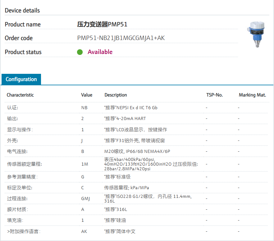 :: Modular.认证: NB “推荐”NEPSI Ex d IIC T6 Gb 输出: 2 “推荐”4-20mA HART 显示与操作: 1 “推荐”LCD液晶显示,按键操作 外壳: J “推荐”F31铝外壳, 带玻璃视窗 电气连接: B M20螺纹, IP66/68 NEMA4X/6P 传感器额定量程: 1M 表压4bar/400kPa/60psi, 40mH2O/133ftH2O/1600inH2O 过压极限值: 28bar/2.8MPa/420psi 参考测量精度: G “推荐”标准级 标定及单位: C 传感器量程; kPa/MPa 过程连接: GMJ “推荐”ISO228 G1/2螺纹,内孔径 11.4mm, 316L 膜片材质: A “推荐”316L 填充油: 1 “推荐”硅油 >附加操作语言: AK “推荐”简体中文