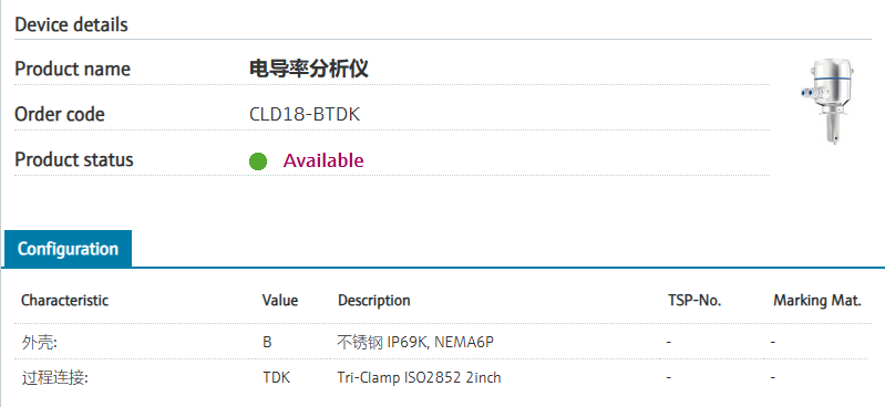 CLD18-BTDK 订货号 CLD18-1014/0 扩展订货号 (CLD18-BTDK) 名称 电导率分析仪 基本描述 Measuring system conductivity, inductive