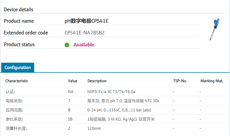 CPS41E-NA7BSB2 订货号 CPS41E-12L5/0 扩展订货号 (CPS41E-NA7BSB2) 名称 pH数字电极CPS41E 基本描述 pH glass comb. sensor, Memosens 2.0.