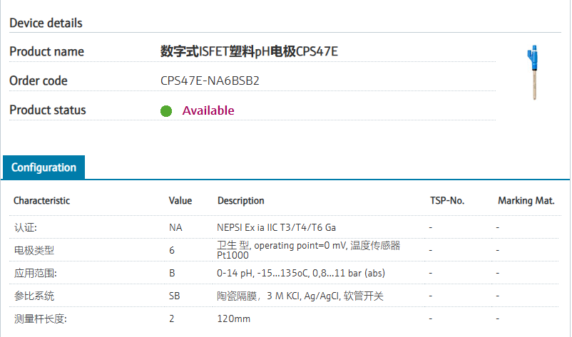 CPS47E-NA6BSB2 订货号 CPS47E-11N6/0 扩展订货号 (CPS47E-NA6BSB2) 名称 数字式ISFET塑料pH电极CPS47E 基本描述 pH comb. sensor, ISFET Technology,