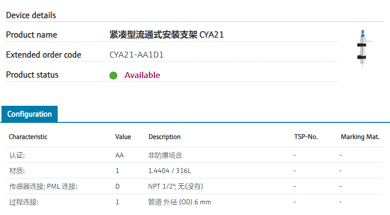 CYA21-AA1D1 订货号 CYA21-1014/0 扩展订货号 (CYA21-AA1D1) 名称 紧凑型流通式安装支架 CYA21 基本描述 Stainless steel flow-through assembly