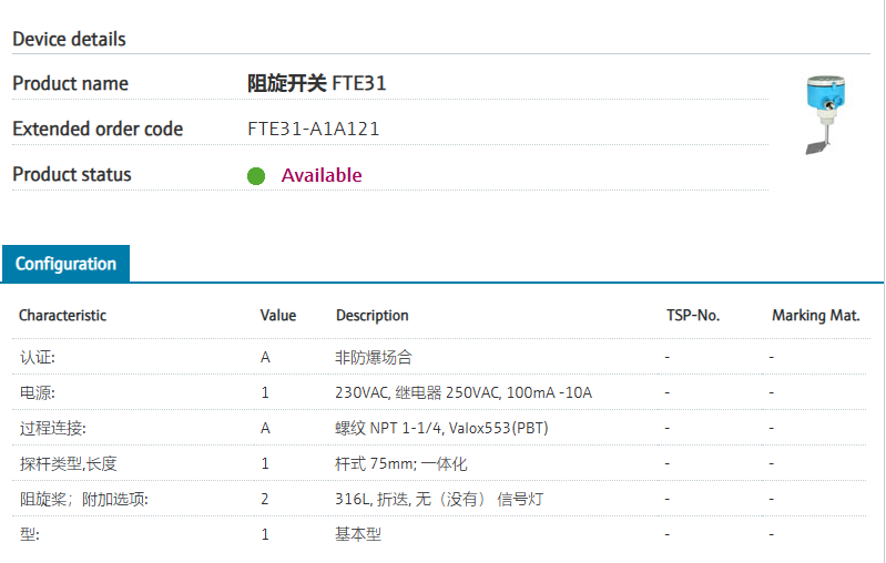 FTE31-A1A121 扩展订货号 FTE31-A1A121 名称 **阻旋开关 FTE31 基本描述 Level limt switch, Paddel.