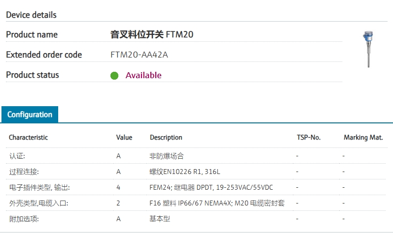 FTM20-AA42A 扩展订货号 FTM20-AA42A 名称 音叉料位开关 FTM20 基本描述 点式物位仪 音叉震动式