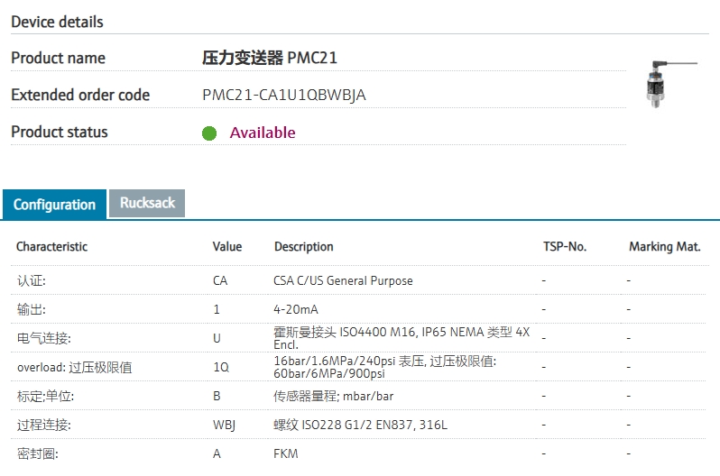 ::长期稳定性高+抗过载能力强认证: CA CSA C/US General Purpose 输出: 1 4-20mA 电气连接: U 霍斯曼接头 ISO4400 M16, IP65 NEMA 类型 4X Encl. overload: 过压极限值 1Q 16bar/1.6MPa/240psi 表压, 过压极限值: 60bar/6MPa/900psi 标定;单位: B 传感器量程; mbar/bar 过程连接: WBJ 螺纹 ISO228 G1/2 EN837, 316L 密封圈: A FKM