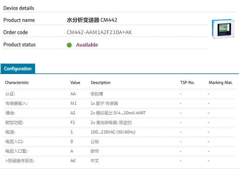CM442-AAM1A2F210A+AK 订货号 CM442-3L11/0 扩展订货号 (CM442-AAM1A2F210A+AK) 名称 水分析变送器 CM442 基本描述 Transmitter liquid analysis