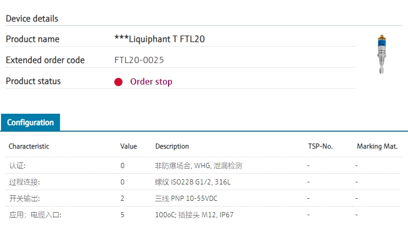 替代FTL20-0025 最常用的音叉液位开关,最经济的型号,满足大量液位开关的需求,常备现货,非常经济实惠! 24V M12航空接头,常温,螺纹G1/2连接,3线PNP输出。