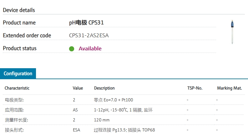 CPS31-2AS2ESA 订货号 CPS31-2AS2ESA 扩展订货号 (CPS31-2AS2ESA) 名称 pH电极 CPS31 基本描述 pH-comb. electrode