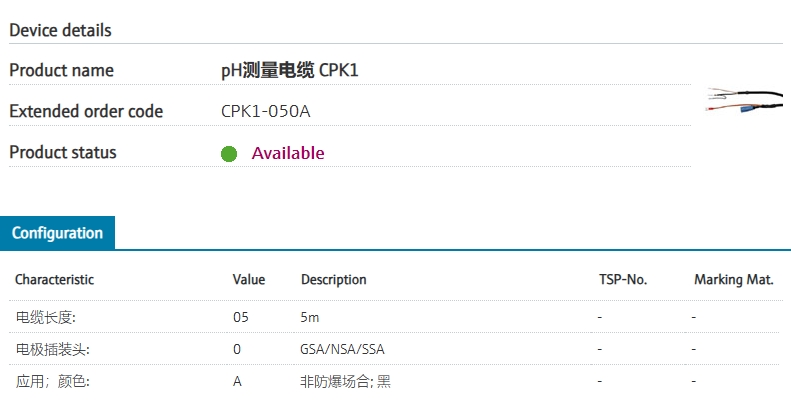 E+H数字电极电缆,适合所有带memosens接口的电极,支持PH/ORP, 电导率,溶解氧,浊度,余氯.....,阿仪常备大量5米,10米的现货,价格优惠,欢迎采购 CYK10-A031 电缆长度3米 CYK10-A051 电缆长度5米 CYK10-A101 电缆长度10米 CYK10-A151 电缆长度15米 CYK10-A201 电缆长度20米