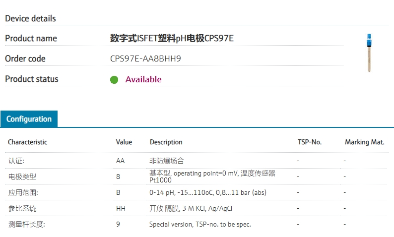 CPS97E-AA8BHH9 订货号 CPS97E-11C6/0 扩展订货号 (CPS97E-AA8BHH9) 名称 数字式ISFET塑料pH电极CPS97E 基本描述 pH comb. sensor, ISFET Technology,