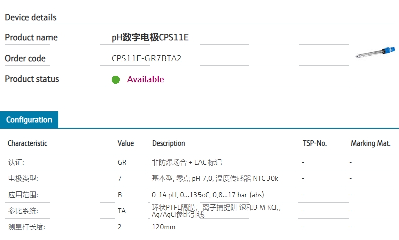 and environmental.认证: GR 非防爆场合 + EAC 标记 电极类型: 7 基本型, 零点 pH 7,0, 温度传感器 NTC 30k 应用范围: B 0-14 pH, 0...135oC, 0,8...17 bar (abs) 参比系统: TA 环状PTFE隔膜;离子捕捉阱 饱和3 M KCl,;Ag/AgCl参比引线 测量杆长度: 2 120mm