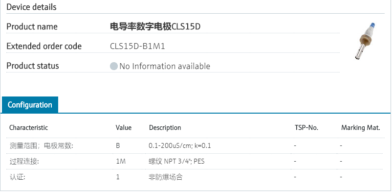 Materials: 316L; PES测量范围;电极常数: B 0.1-200uS/cm; k=0.1 过程连接: 1M 螺纹 NPT 3/4"; PES 认证: 1 非防爆场合 型号参数