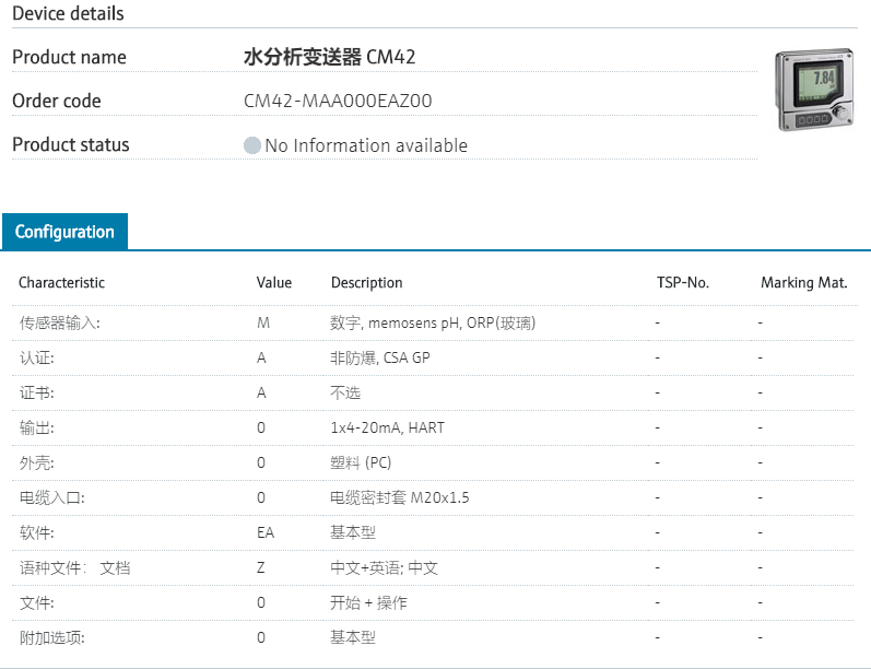 :: Functionality easily changeable传感器输入: M 数字, memosens pH, ORP(玻璃) 认证: A 非防爆, CSA GP 证书: A 不选 输出: 0 1x4-20mA, HART 外壳: 0 塑料 (PC) 电缆入口: 0 电缆密封套 M20x1.5 软件: EA 基本型 语种文件: 文档 Z 中文+英语; 中文 文件: 0 开始 + 操作 附加选项: 0 基本型