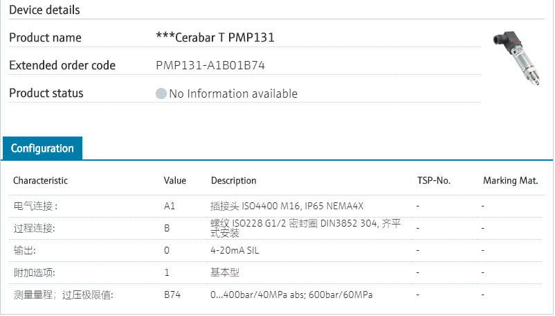 防爆,量程1.6MPa绝压,M20x1.5过程连接,带M16插接头,4-20ma输出 PMP131的型号已经停产,替代型号:PMP21-BA1U1QBX4J