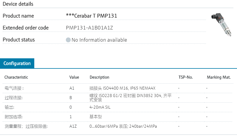 防爆,量程1.6MPa绝压,M20x1.5过程连接,带M16插接头,4-20ma输出 PMP131的型号已经停产,替代型号:PMP21-BA1U1QBX4J