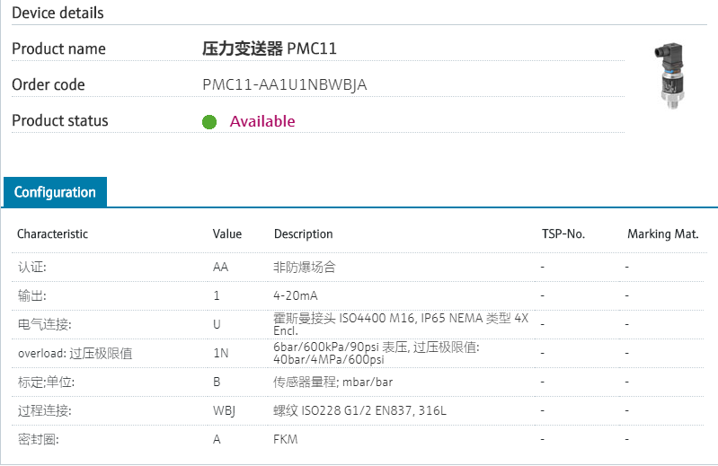 ::长期稳定性高+抗过载能力强认证: AA 非防爆场合 输出: 1 4-20mA 电气连接: U 霍斯曼接头 ISO4400 M16, IP65 NEMA 类型 4X Encl. overload: 过压极限值 1N 6bar/600kPa/90psi 表压, 过压极限值: 40bar/4MPa/600psi 标定;单位: B 传感器量程; mbar/bar 过程连接: WBJ 螺纹 ISO228 G1/2 EN837, 316L 密封圈: A FKM