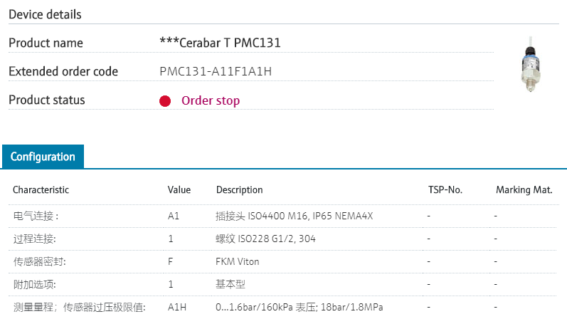 防爆,量程1.6MPa绝压,M20x1.5过程连接,带M16插接头,4-20ma输出 PMP131的型号已经停产,替代型号:PMP21-BA1U1QBX4J