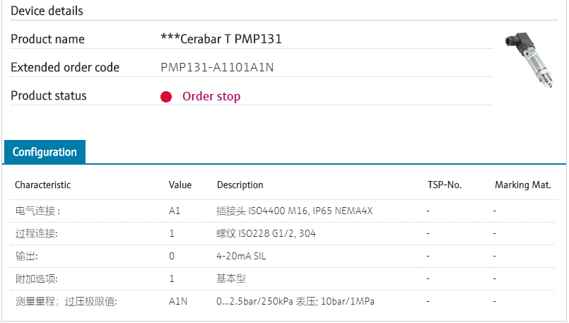 防爆,量程1.6MPa绝压,M20x1.5过程连接,带M16插接头,4-20ma输出 PMP131的型号已经停产,替代型号:PMP21-BA1U1QBX4J