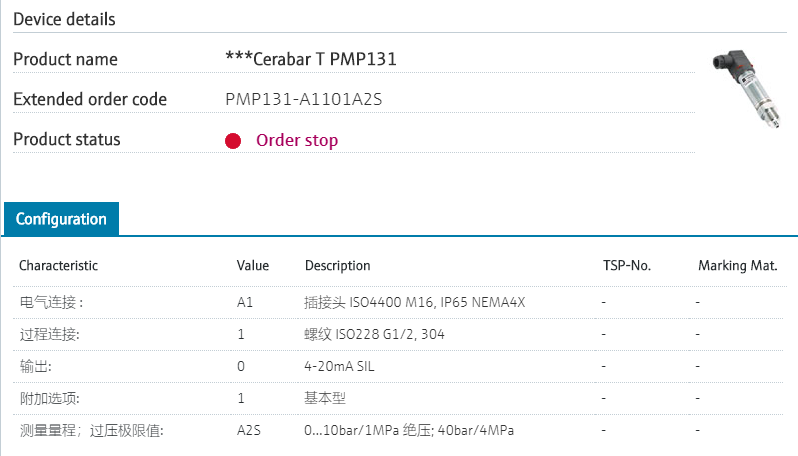 防爆,量程1.6MPa绝压,M20x1.5过程连接,带M16插接头,4-20ma输出 PMP131的型号已经停产,替代型号:PMP21-BA1U1QBX4J