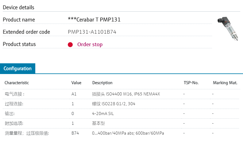 防爆,量程1.6MPa绝压,M20x1.5过程连接,带M16插接头,4-20ma输出 PMP131的型号已经停产,替代型号:PMP21-BA1U1QBX4J