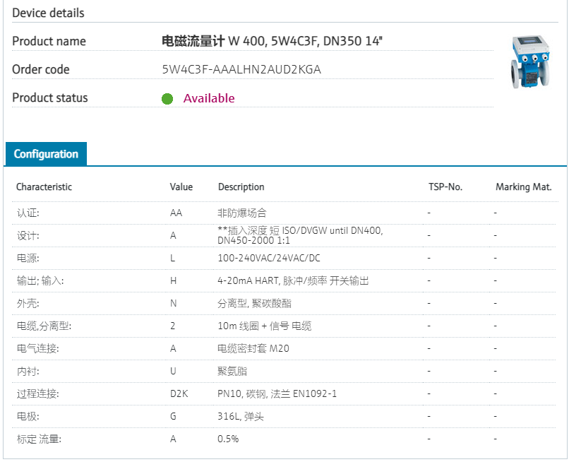 5W4C3F-AAALHN2AUD2KGA 5W4C3F-3VM7/0 (5W4C3F-AAALHN2AUD2KGA) 电磁流量计 W 400,5W4C3F, DN350 14' 防爆认证: AA 非防爆场合 设计: A 电源: L 100-240VAC/24VAC/DC 输出; 输入: H 4-20mA HART, 脉冲/频率 开关输出 外壳: N 分体型, 聚碳酸酯 分体型电缆: 2 10m 信号电缆 电气连接: A 电缆密封套 M20 内衬: U 聚氨脂 过程连接: D2K PN10, 碳钢, 法兰 EN1092-1 电极: G 316L, 弹头 标定 流量: A 0.5% 产品型号