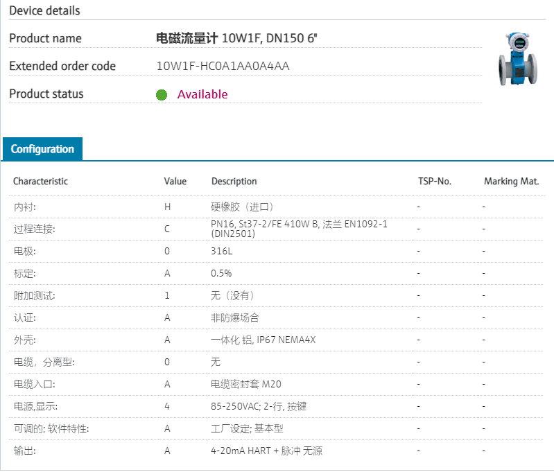 10W1F-HC0A1AA0A4AA 扩展订货号 10W1F-HC0A1AA0A4AA 名称 ***电磁流量计 10W1F, DN150 6" 内衬: H 硬橡胶(进口,不推荐) 过程连接: C PN16, St37-2/FE 410W B, 碳钢法兰 EN1092-1 (DIN2501) 电极: 0 316L 标定: A 0.5% 附加测试: 1 无(没有) 认证: A 非防爆场合 外壳: A 一体化 铝, IP67 NEMA4X 分体型电缆: 0 无 电缆入口: A 电缆密封套 M20 电源,显示: 4 85-250VAC; 2-行, 按键 出厂参数设置 A 默认设置 输出: A 4-20mA HART + 脉冲 无源 产品型号