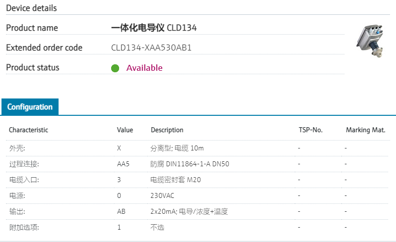 CLD134-XAA530AB1 扩展订货号 CLD134-XAA530AB1 名称 一体化电导仪 CLD134 基本描述 Measuring system, conductivity