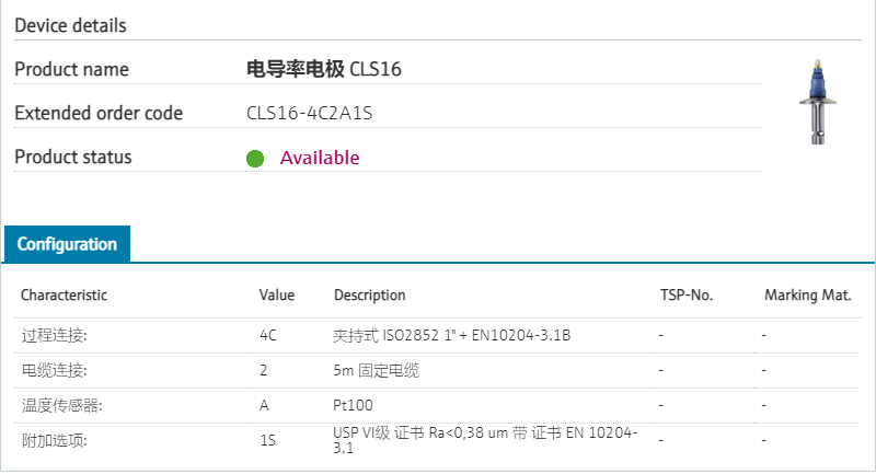 CLS16-4C2A1S,带5米电缆的卫生型电导率电极。连接; 夹持式 ISO2852 1'' + EN10204-3.1B 连接; 5m 固定电缆 温度传感器; Pt100 附加选项; USP VI级 证书 Ra<0.38 um 带证书 EN 10204-3.1