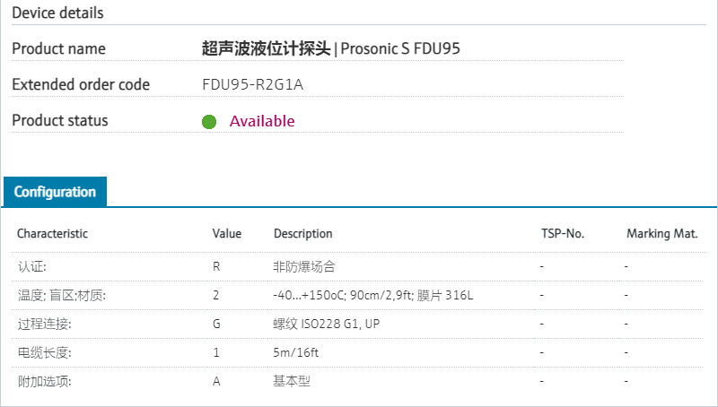 :: Automatic sensor recognition认证: R 非防爆场合 温度; 盲区;材质: 2 -40...+150oC; 90cm/2,9ft; 膜片 316L 过程连接: G 螺纹 ISO228 G1, UP 电缆长度: 1 5m/16ft 附加选项: A 基本型 产品型号