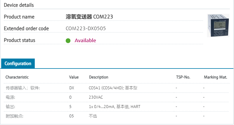 COM223-DX0505 扩展订货号 COM223-DX0505 名称 溶氧变送器 COM223 基本描述 Transmitter, dissolved oxygen DO.