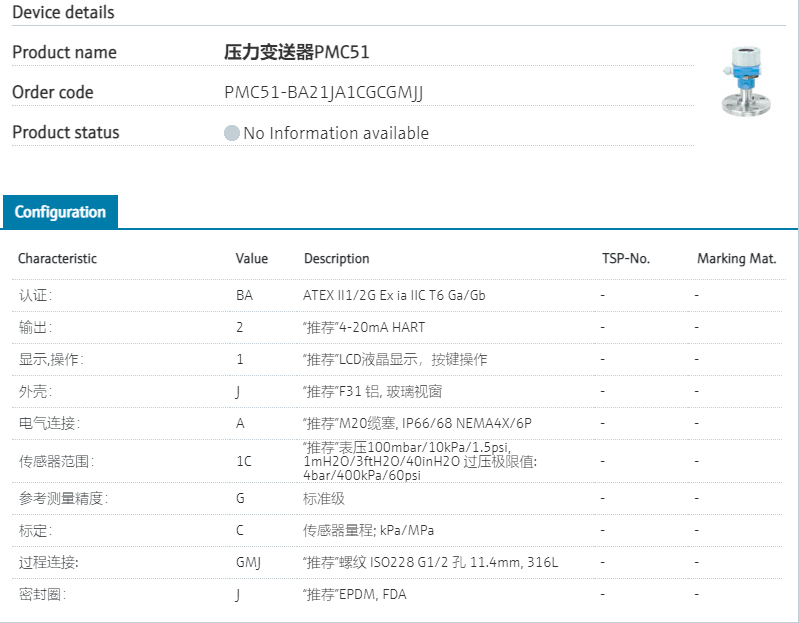 :: Modular.认证: BA ATEX II1/2G Ex ia IIC T6 Ga/Gb 输出: 2 “推荐”4-20mA HART 显示,操作: 1 “推荐”LCD液晶显示,按键操作 外壳: J “推荐”F31 铝, 玻璃视窗 电气连接: A “推荐”M20缆塞, IP66/68 NEMA4X/6P 传感器范围: 1C “推荐”表压100mbar/10kPa/1.5psi, 1mH2O/3ftH2O/40inH2O 过压极限值: 4bar/400kPa/60psi 参考测量精度: G 标准级 标定: C 传感器量程; kPa/MPa 过程连接: GMJ “推荐”螺纹 ISO228 G1/2 孔 11.4mm, 316L 密封圈: J “推荐”EPDM, FDA 型号参数