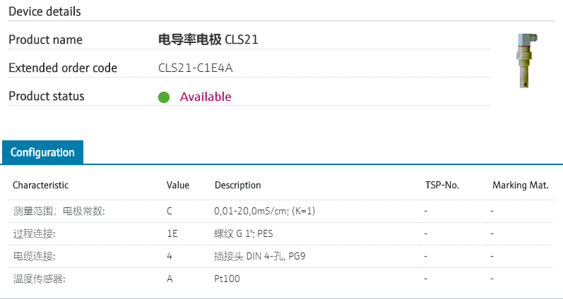 Quality certificate calibration.测量范围;电极常数: C 0,01-20,0mS/cm; (K=1) 过程连接: 1E 螺纹 G 1"; PES 电缆连接: 4 插接头 DIN 4-孔, PG9 温度传感器: A Pt100 型号参数
