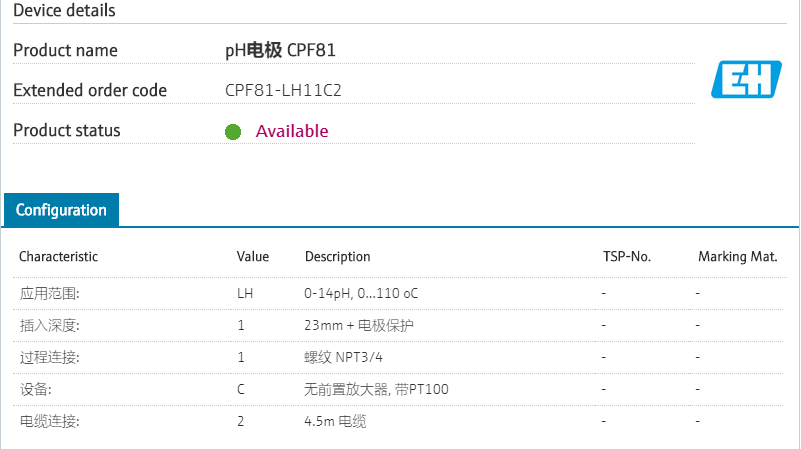 Double chamber应用范围: LH 0-14pH, 0...110℃ 插入深度: 1 23mm + 电极保护 过程连接: 1 螺纹 NPT3/4 设备: C 无前置放大器, 带PT100 电缆连接: 2 4.5m 电缆