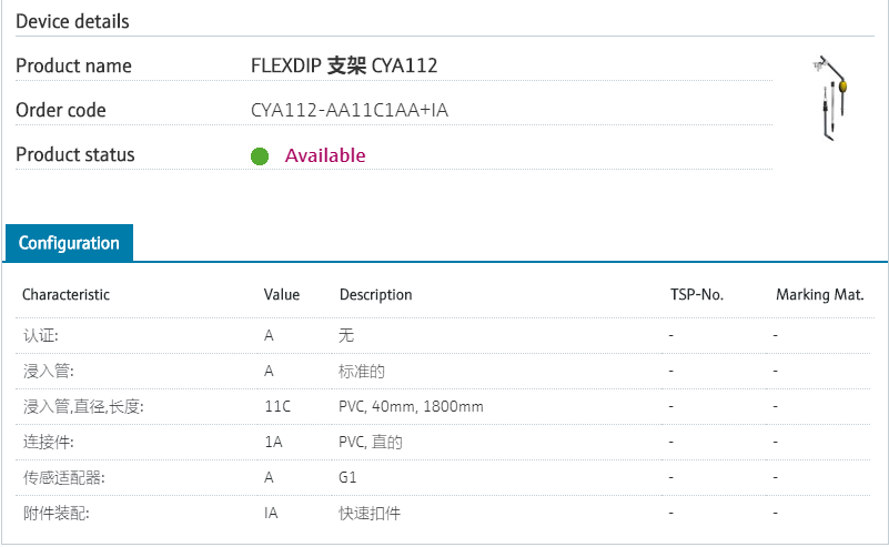 CYA112-AA11C1AA+IA 订货号 CYA112-17V8/0 扩展订货号 (CYA112-AA11C1AA+IA) 名称 FLEXDIP 支架 CYA112 基本描述 Immersion assembly