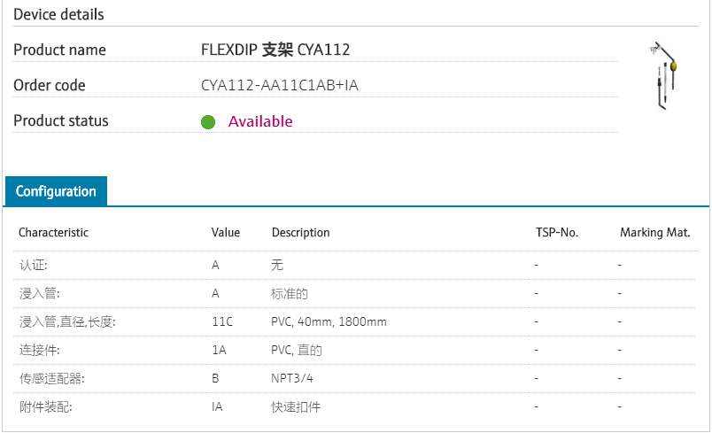 CYA112-AA11C1AB+IA 订货号 CYA112-1976/0 扩展订货号 (CYA112-AA11C1AB+IA) 名称 FLEXDIP 支架 CYA112 基本描述 Immersion assembly
